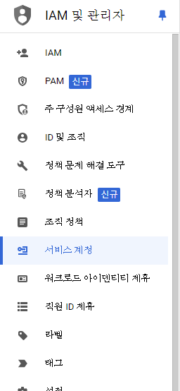 사용자 인증 정보 > 서비스 계정 > 서비스 계정 관리