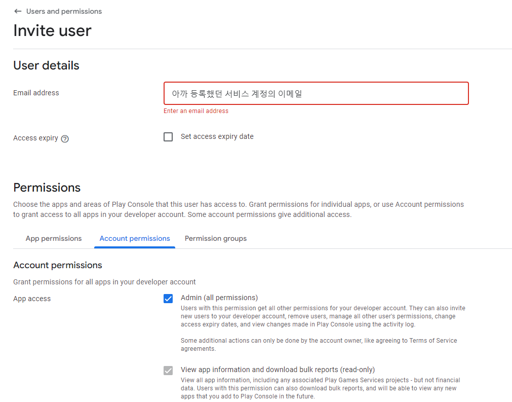 이때 등록한 이메일을 잘 기억하자 플레이 스토어 콘솔에서 권한 등록을 따로 해줘야함