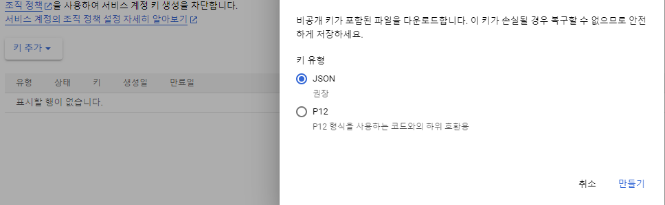 키 관리 > 키 추가에 들어가면 json으로 만들 수 있다 다운로드해주자
